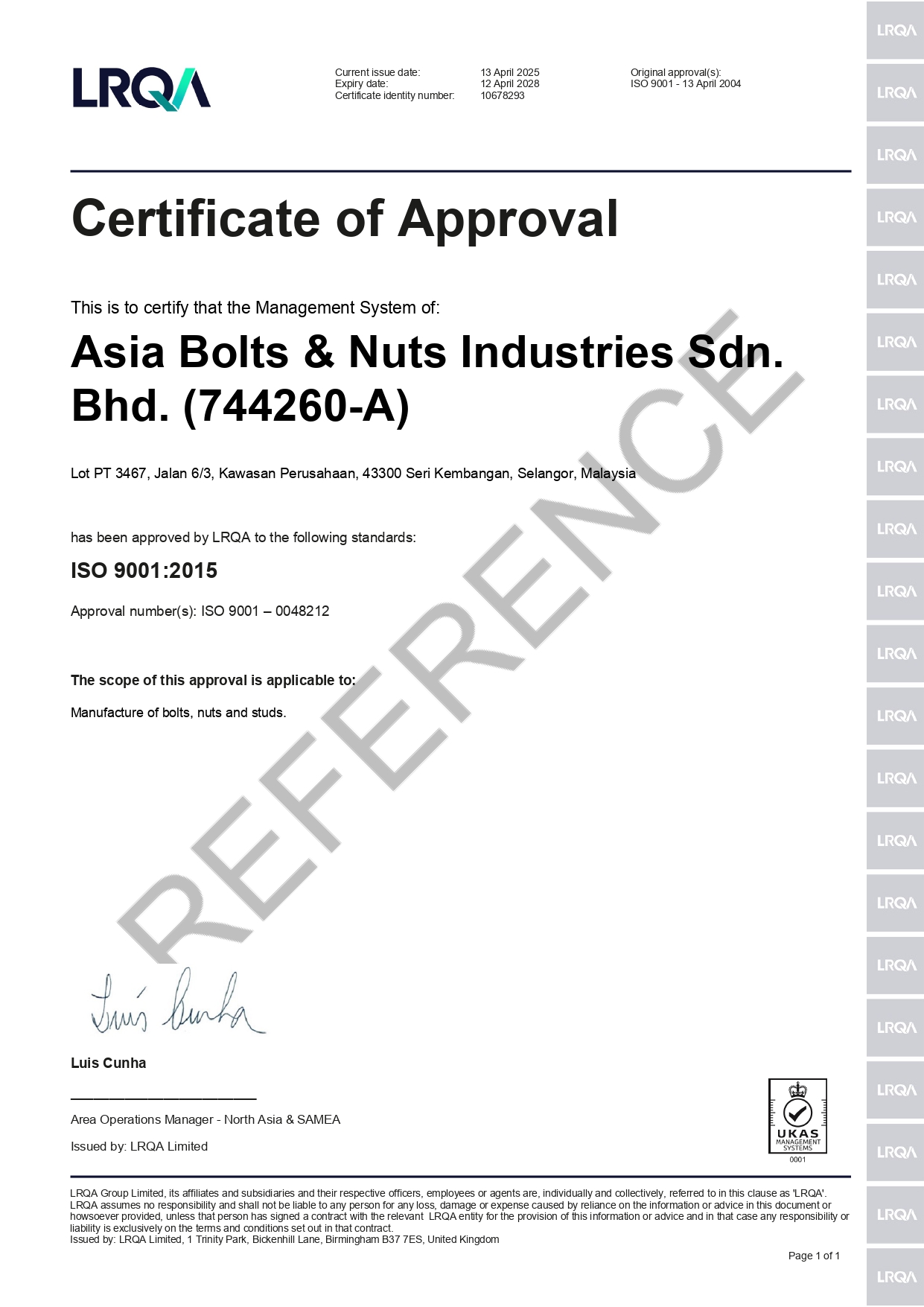 With strong support of our advanced engineering capabilities, our factory - Asia Bolts & Nuts Industries Sdn. Bhd. has been awarded ISO accreditation (Certificate No.: 10180057) in 2004.
